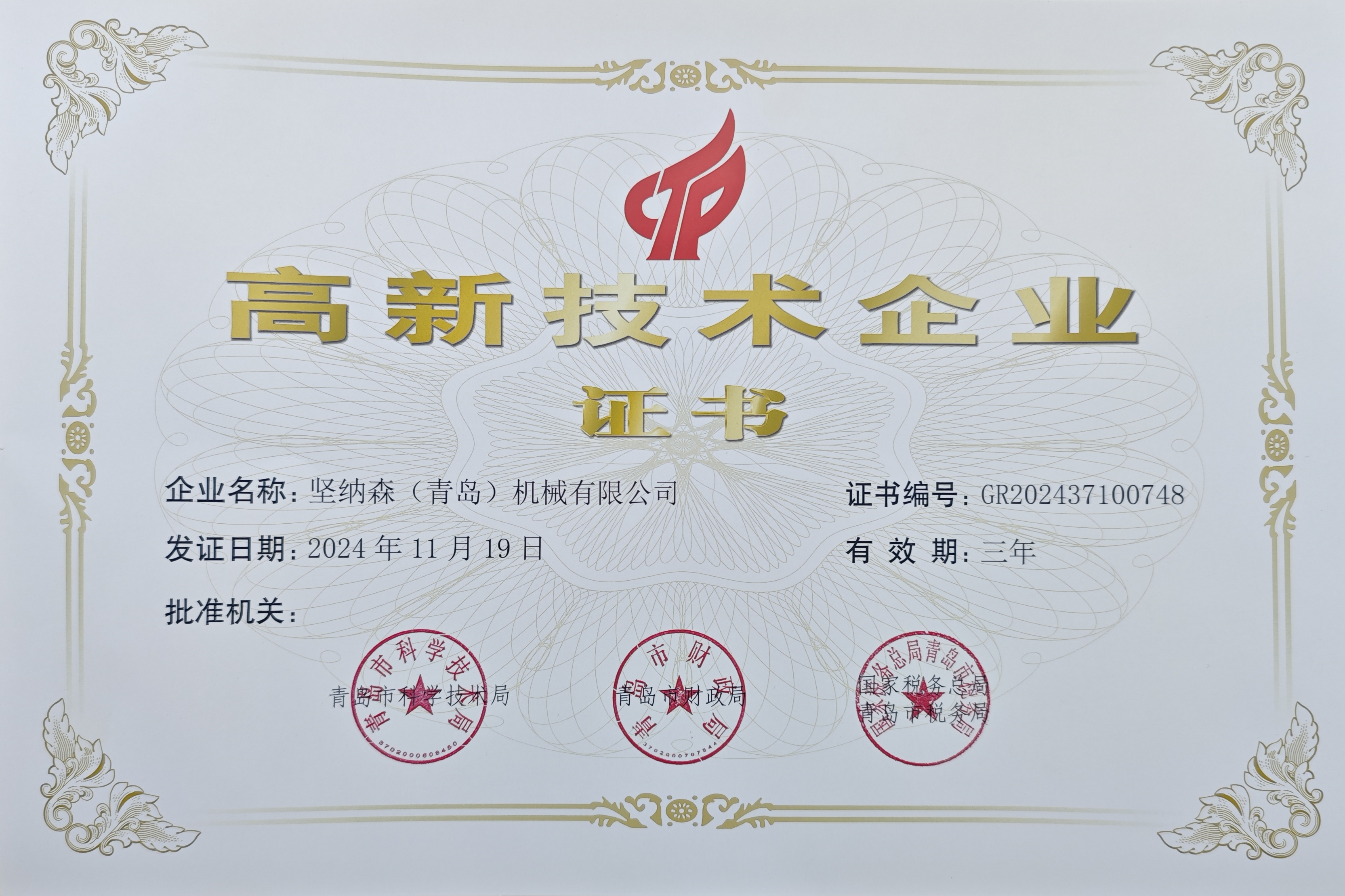 • 熱烈祝賀堅(jiān)納森(青島)機(jī)械有限公司榮獲“高新技術(shù)企業(yè)”再次認(rèn)定!